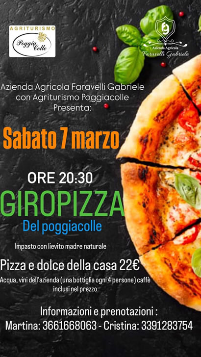 IN PRIMO PIANO… APPUNTAMENTO IMPERDIBILE SABATO 7 MARZO – ORE 20.30 – CON IL GIROPIZZA DEL POGGIACOLLE. PIZZA, con impasto di lievito madre naturale, DOLCE, UNA BOTTIGLIA DI VINO OGNI 4 PERSONE, ACQUA E CAFFE’ EURO 22,00
